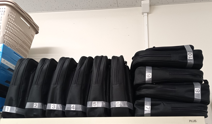 学生さん(Student Assistant)が、授業の準備のためにPCを借りに来るのですが、かばんに小さな名札が取付けられているだけで、棚に入れていると、どのPCが何番かわからず、SAさんは探すのに手間取っていました。 事務の方に話しても「バックを全部買い換えるしかないだろう」ということでした。 外側にシールを貼りもしましたが、ビジネスバッグと同じ合成皮革であり、すぐにシールが落ちてしまいました。