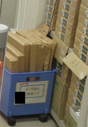 教材の印刷後、コピー用紙の包み紙を利用されておりましたが、B4,A4など分別されず、上から押し込められ、シワクチャになっていました。 それを先生方が取り出し、手で押し広げていました。 だからと、先生方に「コピー用紙の包み紙について、型崩れしないように整理整頓して保存」など言えるわけがありませんし、また、そんな保存場所もありません。 そして。 縦に並べて入れるようにしたら、それで解決しました。 B4とA4をひとつずつ立てておけば、それですぐ伝わりました。 こちらについても、先生方から、かなりの好評をいただきました。